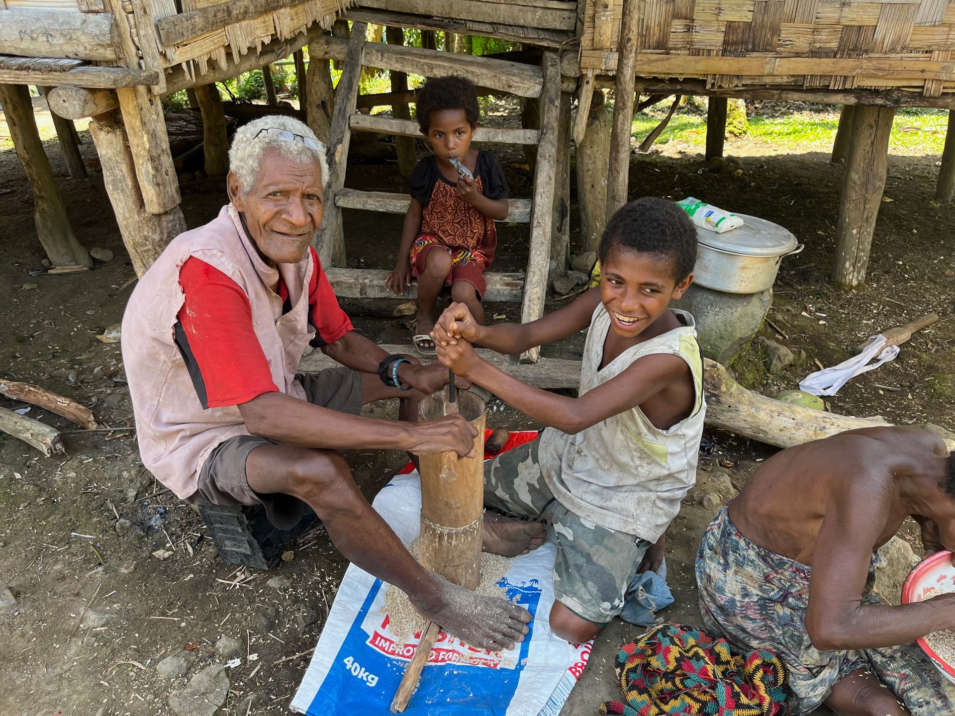 With the holiday, many people have family visiting from other villages. Ruben here was sitting at his house, next to the basketball game, working on milling rice for a big meal with his grandkids.