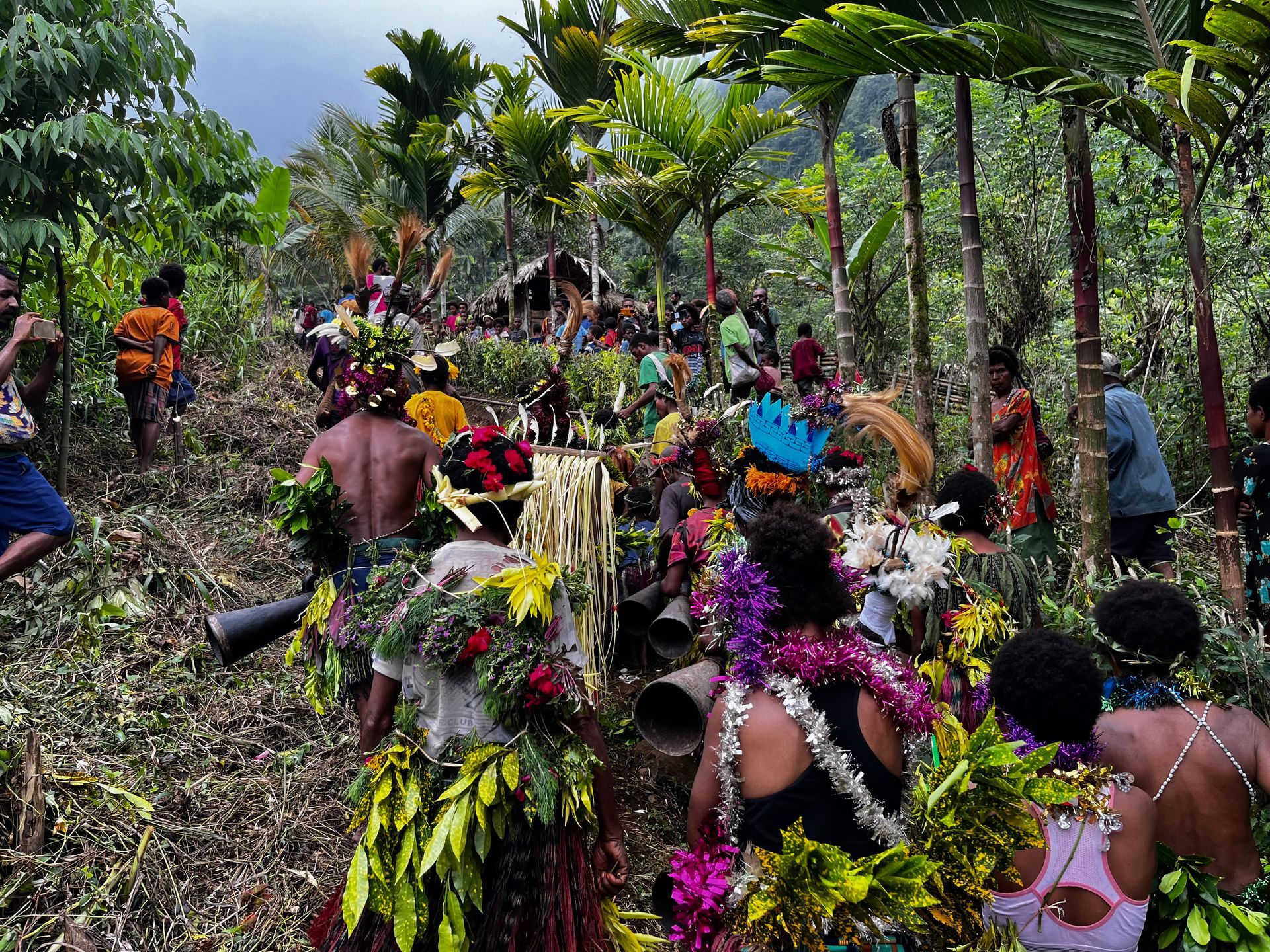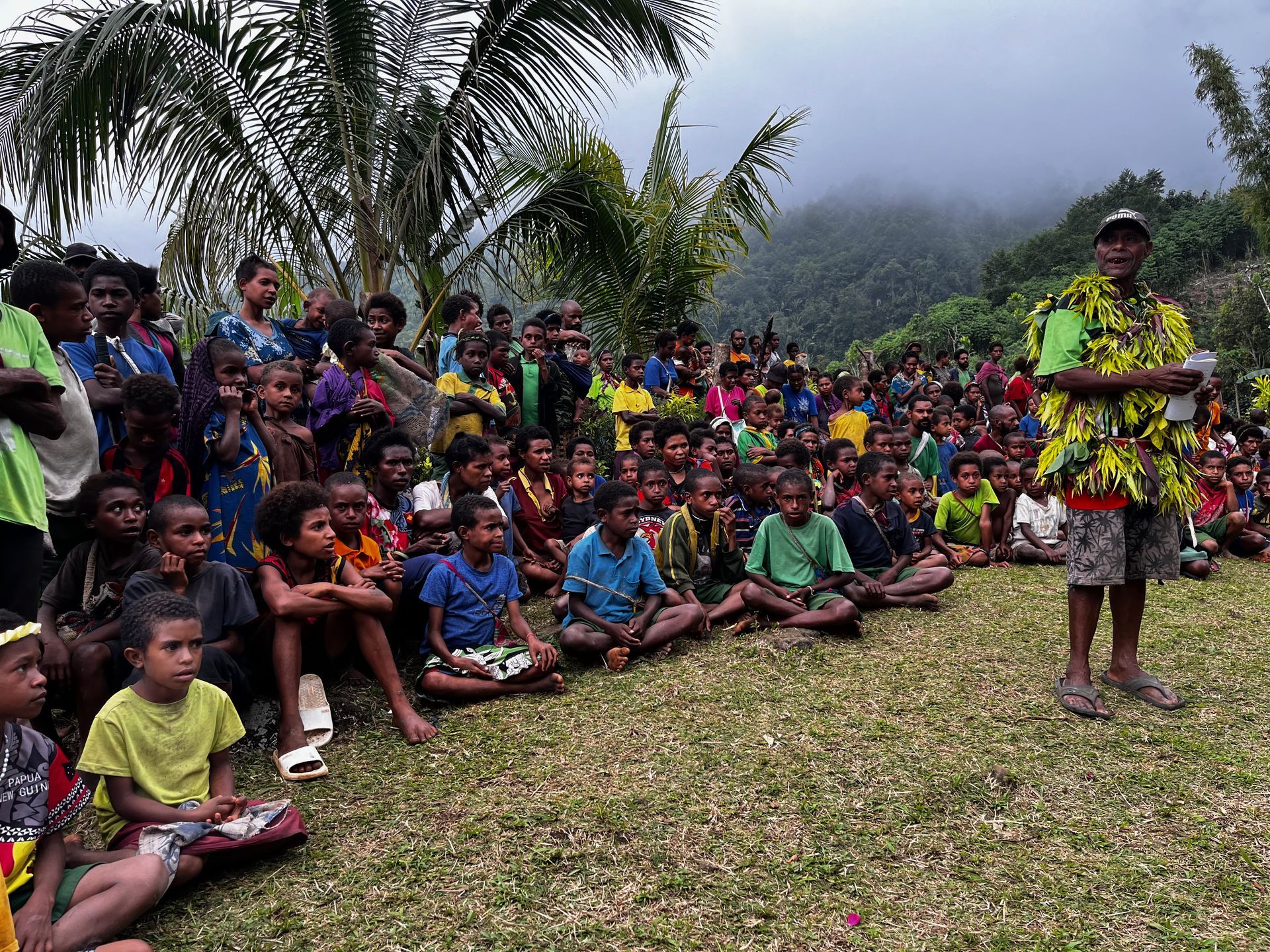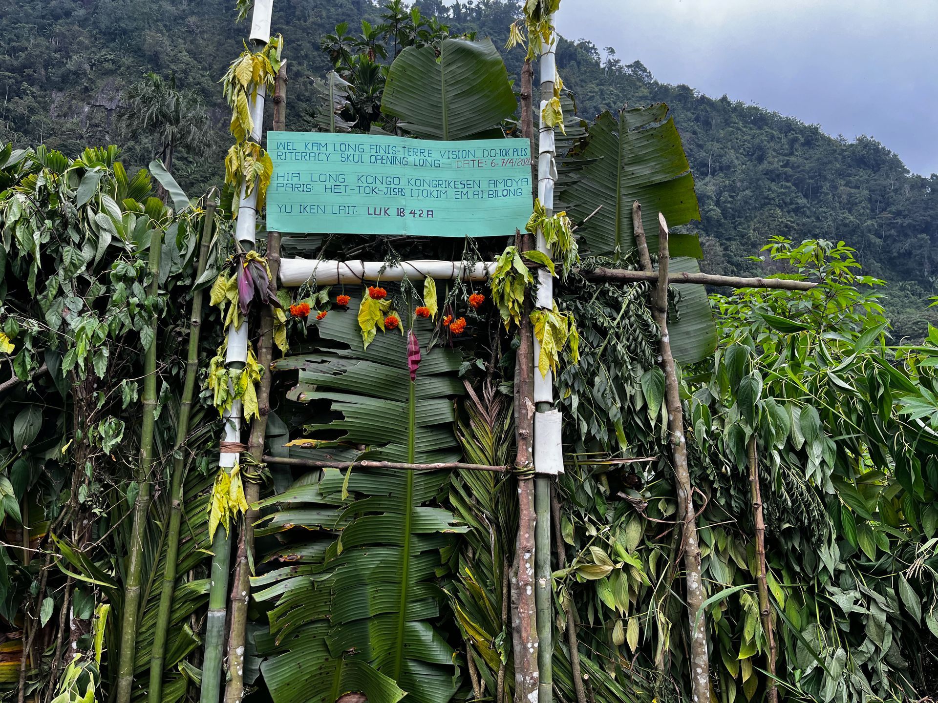 We were met right outside of the village where they did a ceremony. They cut open a heavily decorated door made of banana leaves. If you try, you may be able to make out some of the writing on the sign below (long means "to" or "on" or "in" and tok ples means "local language"):